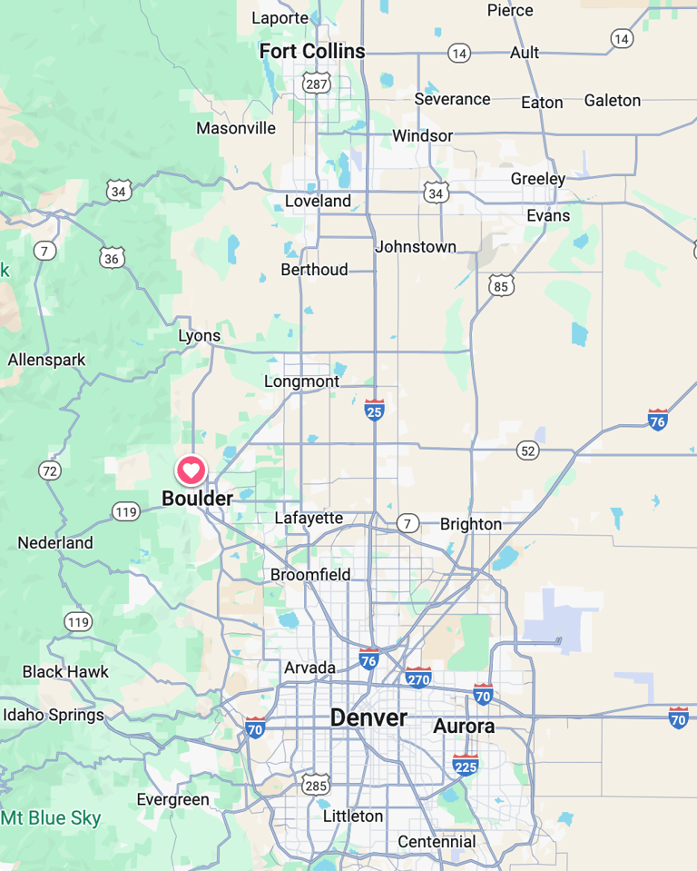 We can meet in any outdoor setting in Northern Colorado, Boulder County, and the Denver metro area.
